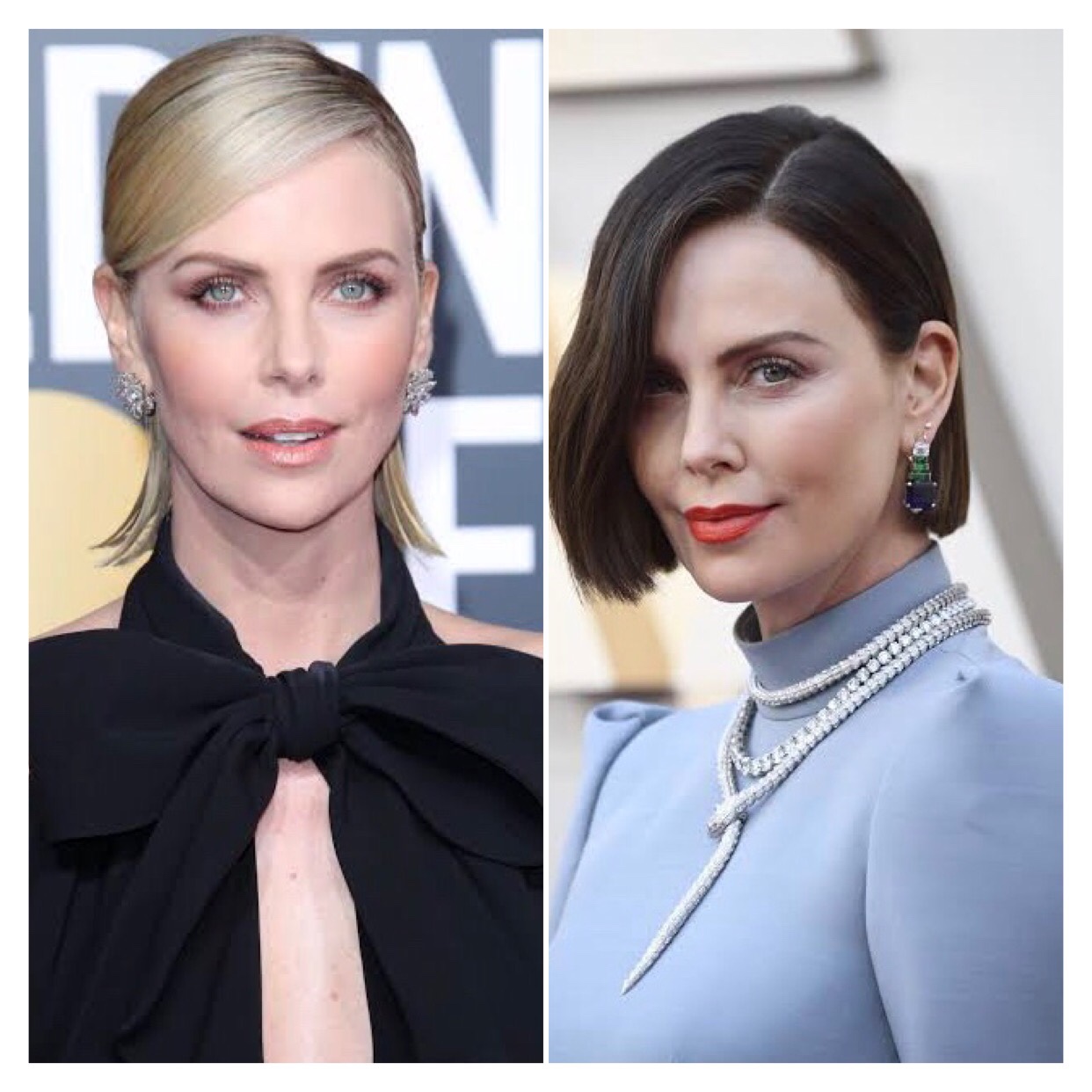 Trouxe dois exemplos para visualizar melhor, a atriz Charlize Theron escureceu os cabelos e ficou com a aparência mais velha e mais pálida, ao ponto que a atriz Cléo Pires pintou os fios de loiro na segunda imagem e na terceira utilizou uma peruca platinada…em ambas ela empalideceu, sendo que na segunda ainda ficou com um aspecto amarelado. Veja a seguir:⠀