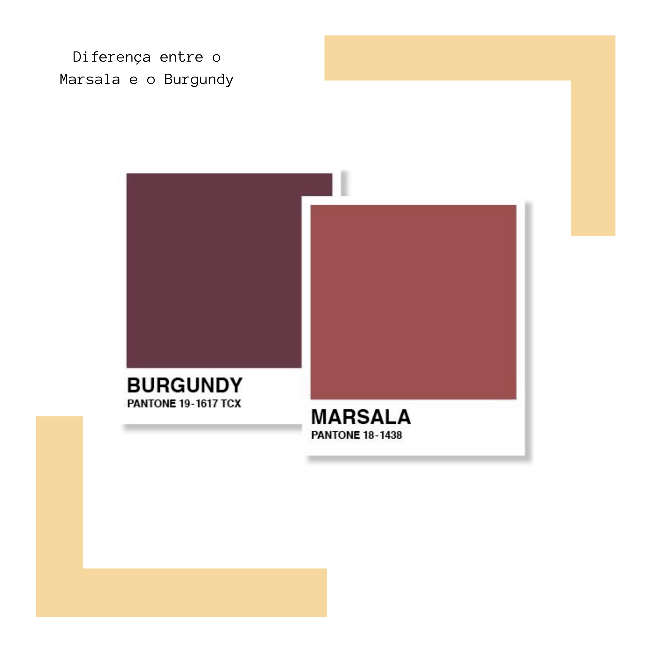 Vejo uma confusão muito grande entre as pessoas com os tons de Burgundy (Borgonha) e o Marsala! Ambos são tons de vinho, mas enquanto o Burgundy é mais vivo, vibrante e puxado para tons frios, o Marsala é mais amarronzado, suave e puxado para tons quentes!