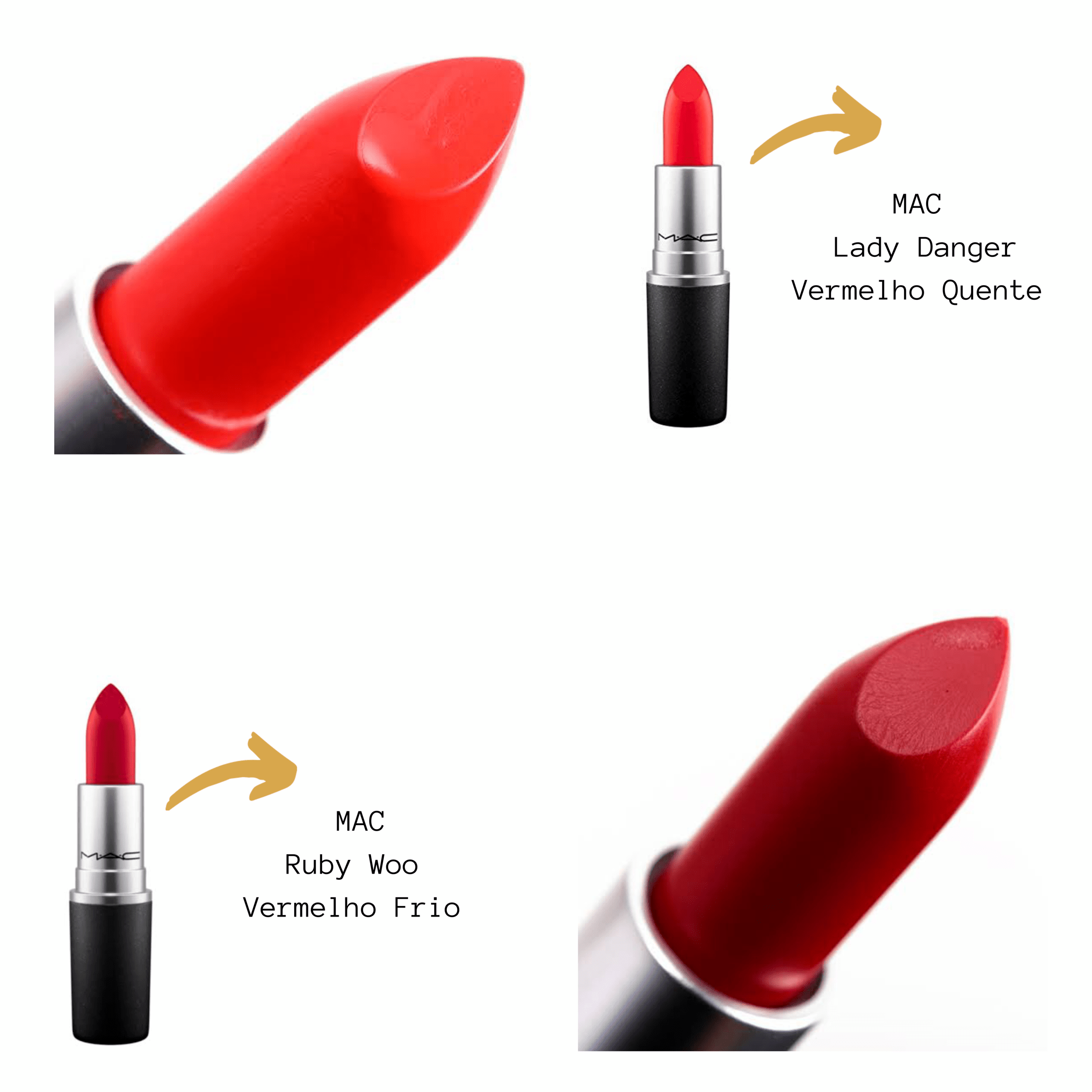 Isso mesmo, mas sendo ele um queridinho nos lábios na hora de uma produção poderosa e sabendo que poucas irão deixar de usá-lo, é bacana escolher a temperatura que melhor vai te beneficiar. Trouxe duas indicações: para peles Quentes ou Neutras Quentes o batom MAC Lady Danger, e para peles Frias ou Neutrass Frias o MAC Ruby Woo.