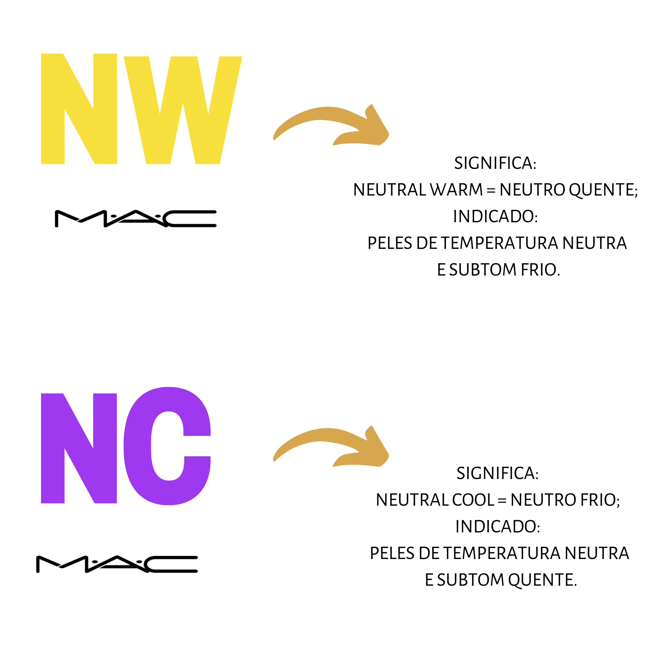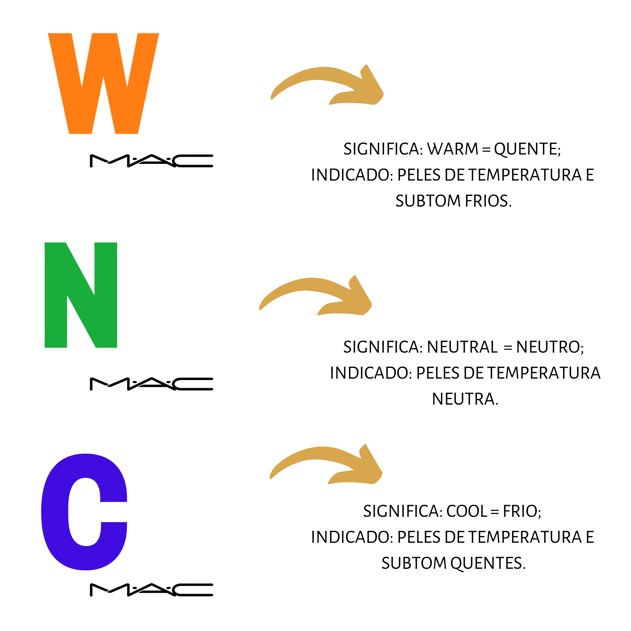 Na realidade, o problema é que a NOMENCLATURA de temperatura e subtom da marca é ao contrário (se você não viu meu post sobre as letrinhas na maquiagem…corre lá ler!) Então, quem geralmente compra maquiagem W (Warm, que é a quente) deve comprar a C na MAC 😬 porque sua nomenclatura é trocada. Veja todos nas imagens! 😉