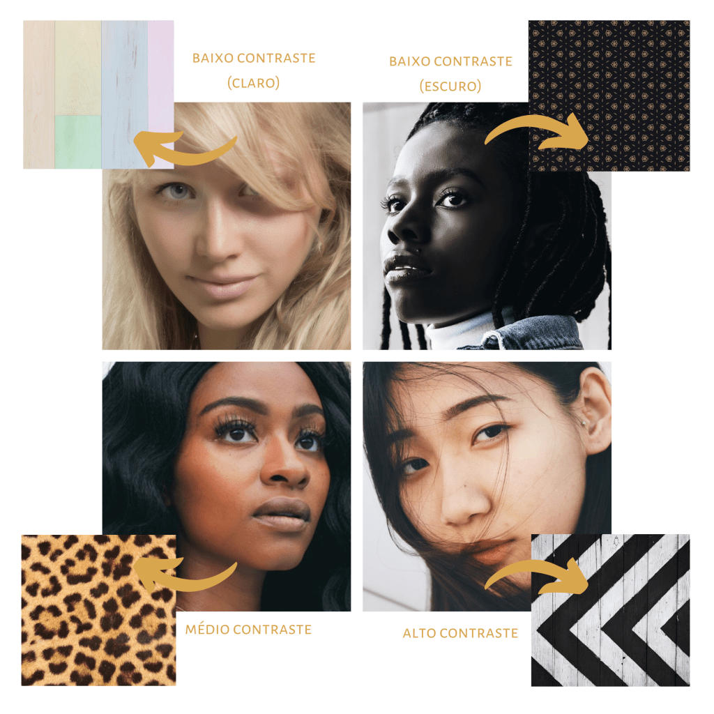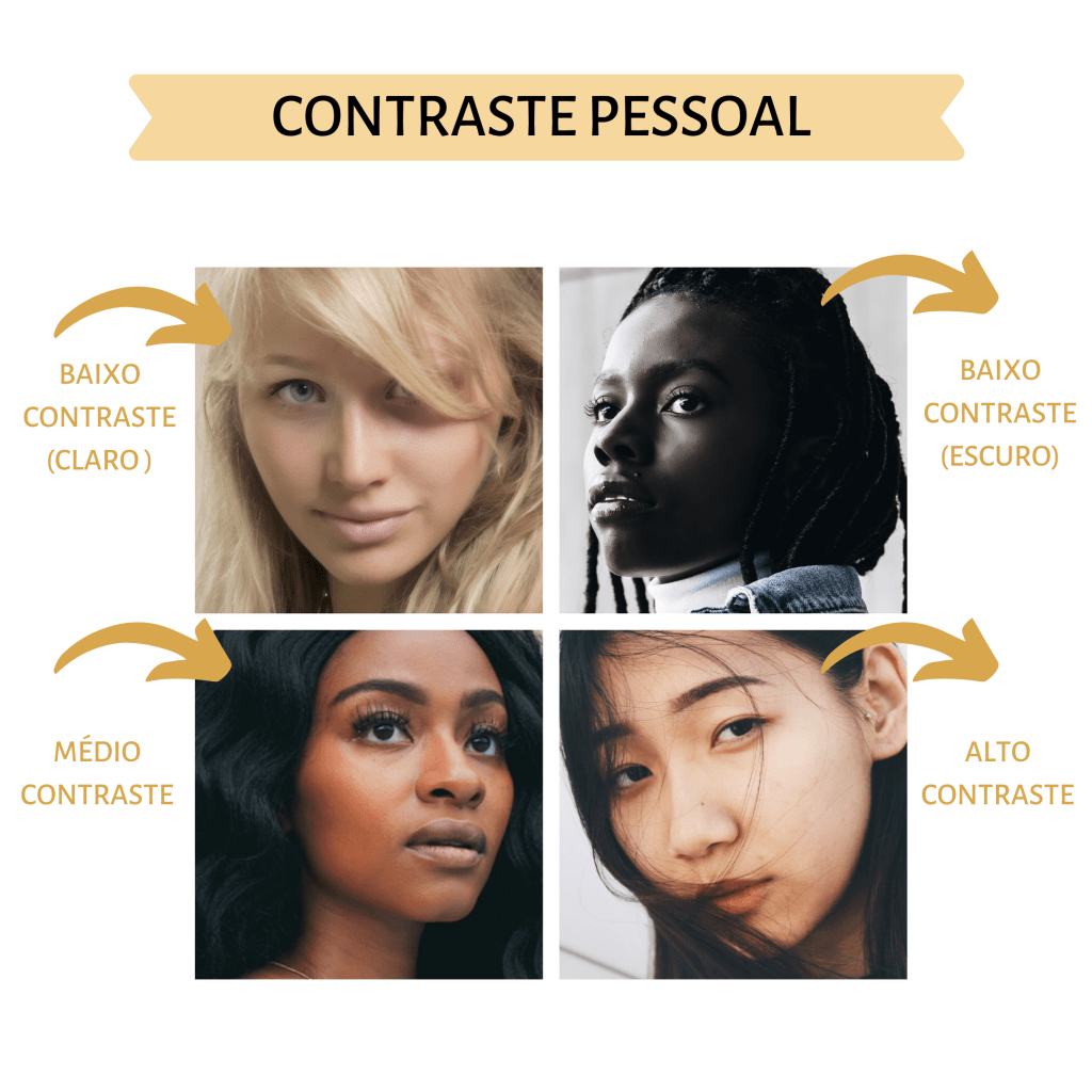 Dee uma forma bem fácil de entender, contraste pessoal é a o nível/escala de diferença de cores entre tons de pele, cabelos, sobrancelhas e olhos! Entendendo melhor o contraste: